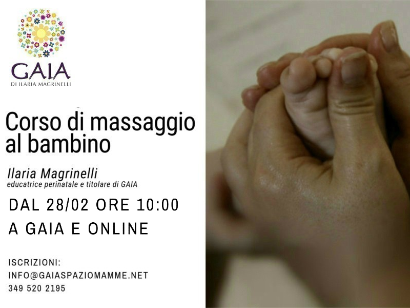 Da lunedì 17 Gennaio 2022 ore 10:30 nuovo corso di massaggio al bambini AIMI. Conduce Ilaria Magrinelli, educatrice perinatale e titolare di GAIA. Il corso si svolgerà a GAIA e online su Skype (e sarà accessibile anche se non disponi ...