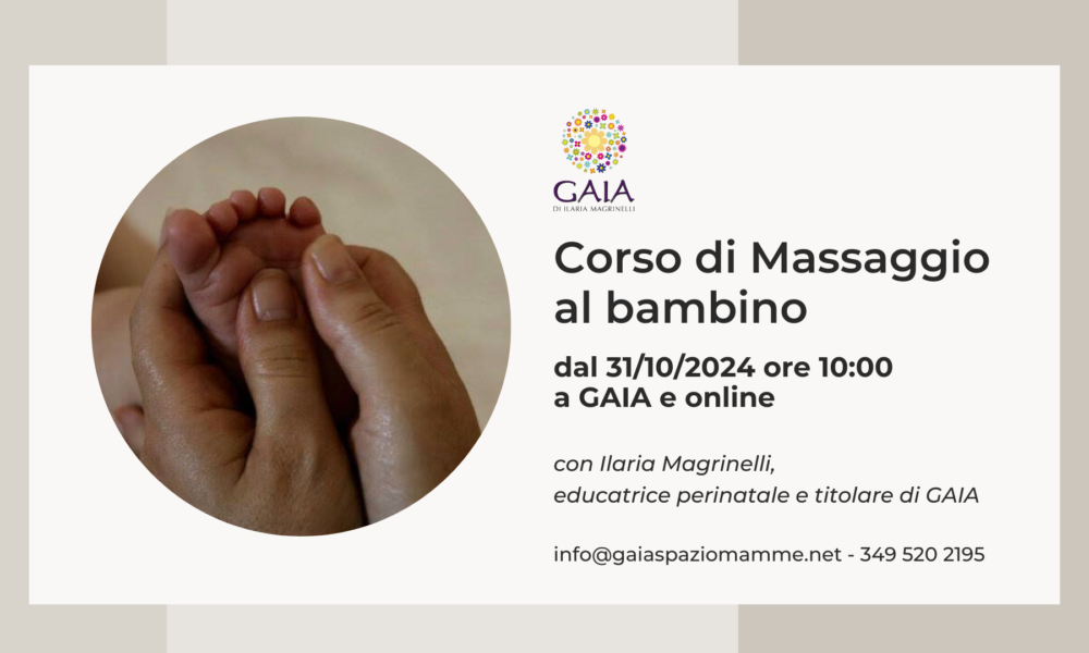 Da giovedì 31 Ottobre 2024 ore 10:00 nuovo corso di massaggio al bambino AIMI. Conduce Ilaria Magrinelli, educatrice perinatale e titolare di GAIA. Il corso si svolgerà a GAIA e online su Skype (e sarà accessibile anche se non disponi ...
