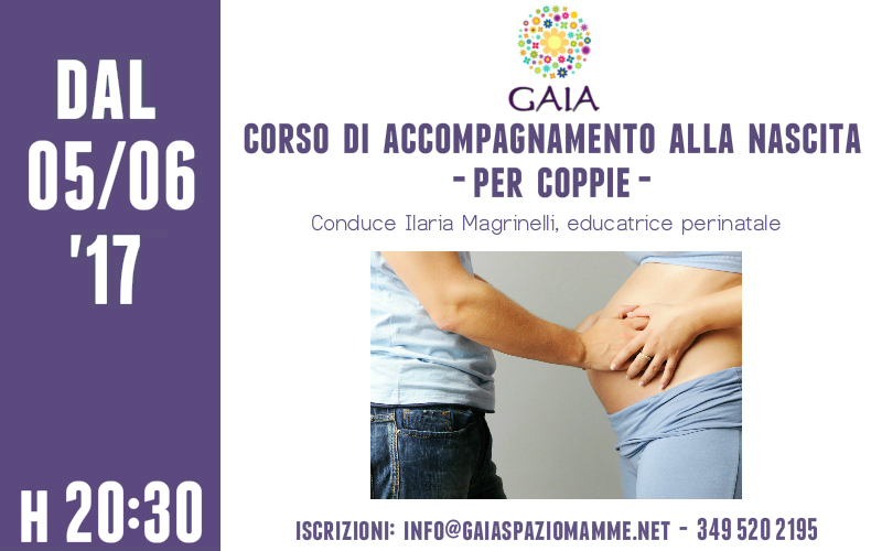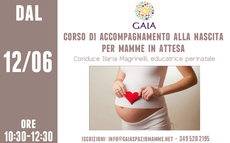 6 incontri dalle ore 10:30 alle ore 12:30 del mattino. Il Corso di Accompagnamento alla Nascita per mamme in attesa inizia lunedì 12 Giugno 2017. Conduce Ilaria Magrinelli, educatrice perinatale e titolare di Gaia.