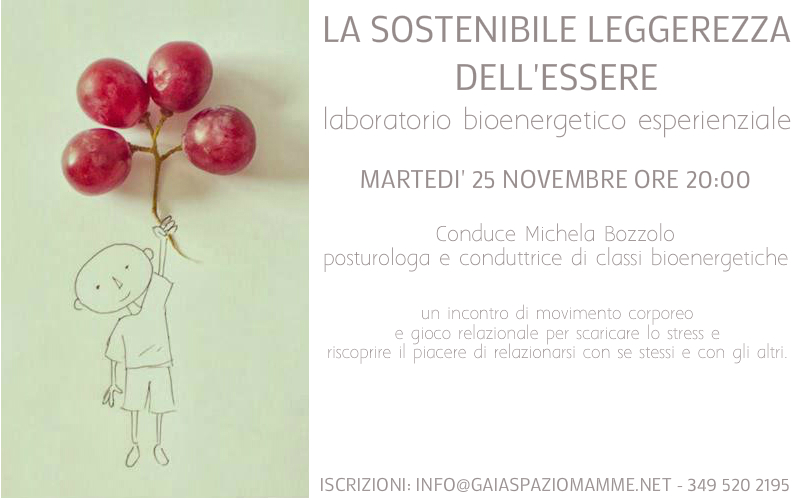 Martedì 25 novembre re 20:00 a Gaia si terrà il primo laboratorio bioenergetico esperienziale. Conduce Michela Bozzolo, posturologa e conduttrice di classi bioenergetiche.