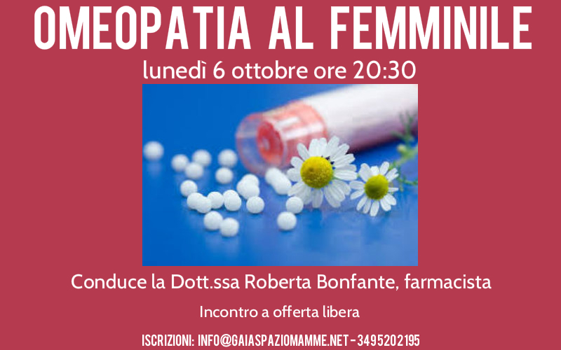 Lunedì 6 ottobre ore 20:30 Conduce la Dott.ssa Roberta Bonfante, farmacista. Per tutte le donne del cerchio di Gaia, una serata dedicata all’omeopatia. Durante l’incontro, rivolto a tutte le donne, mamme e non, scopriremo l’approccio omeopatico… declinato al femminile.