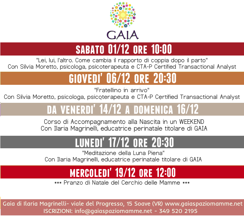 Ecco il programma di incontri e corsi per genitori, famiglie in attesa, donne di tutte le età per il mese di dicembre 2018 a GAIA (Soave, Verona).