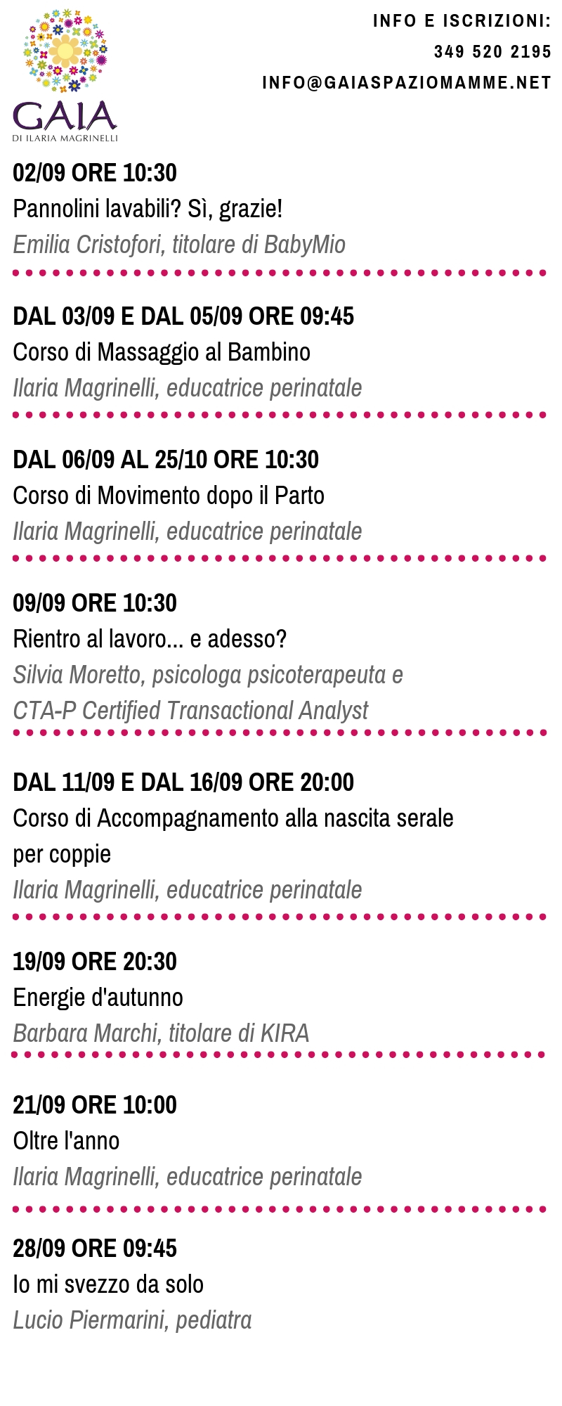 Per info e iscrizioni: info@gaiaspaziomamme.net – 349 520 2195